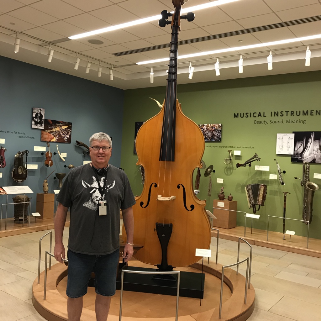| Now, that's a standup bass. Behind Jim is a stool for the artist to stand on while playing. |
